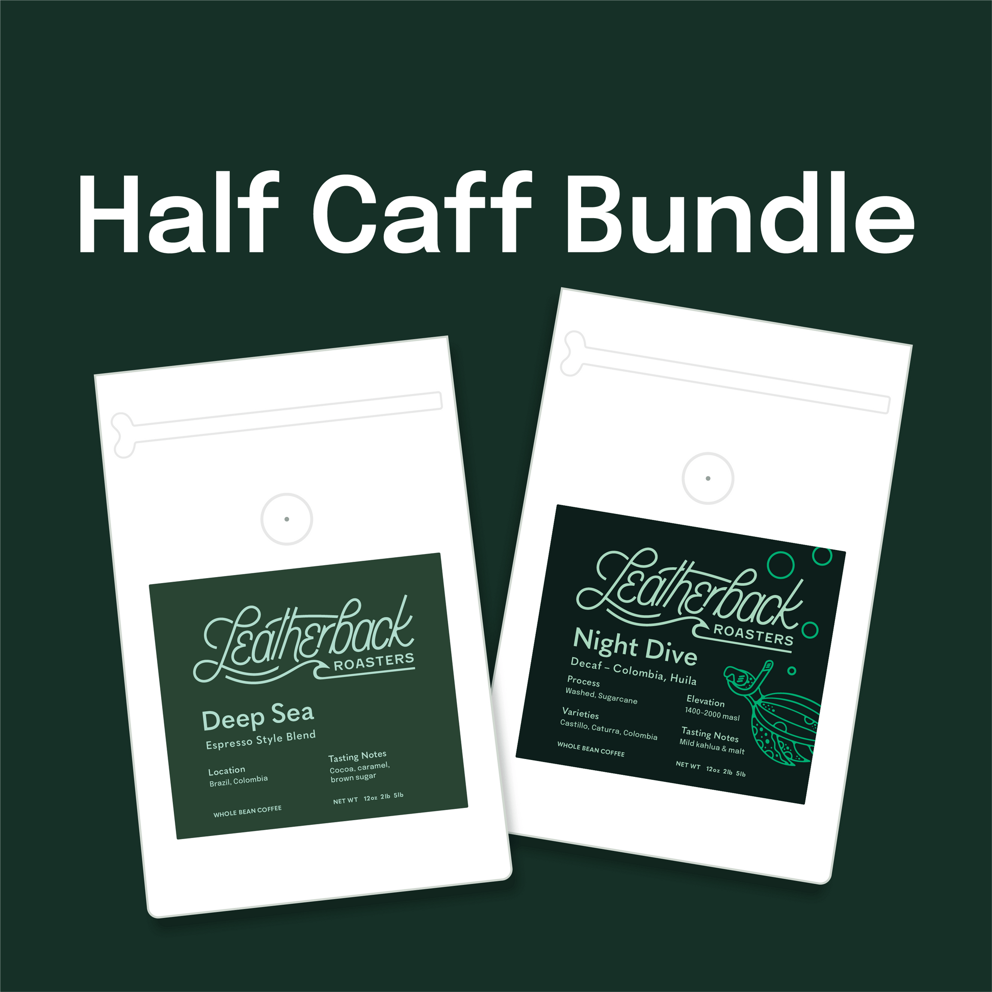 The Half Caff Bundle includes (1) 12-oz. bag of our Deep Sea Espresso blend and (1) 12 oz. bag of our Night Dive Decaf.